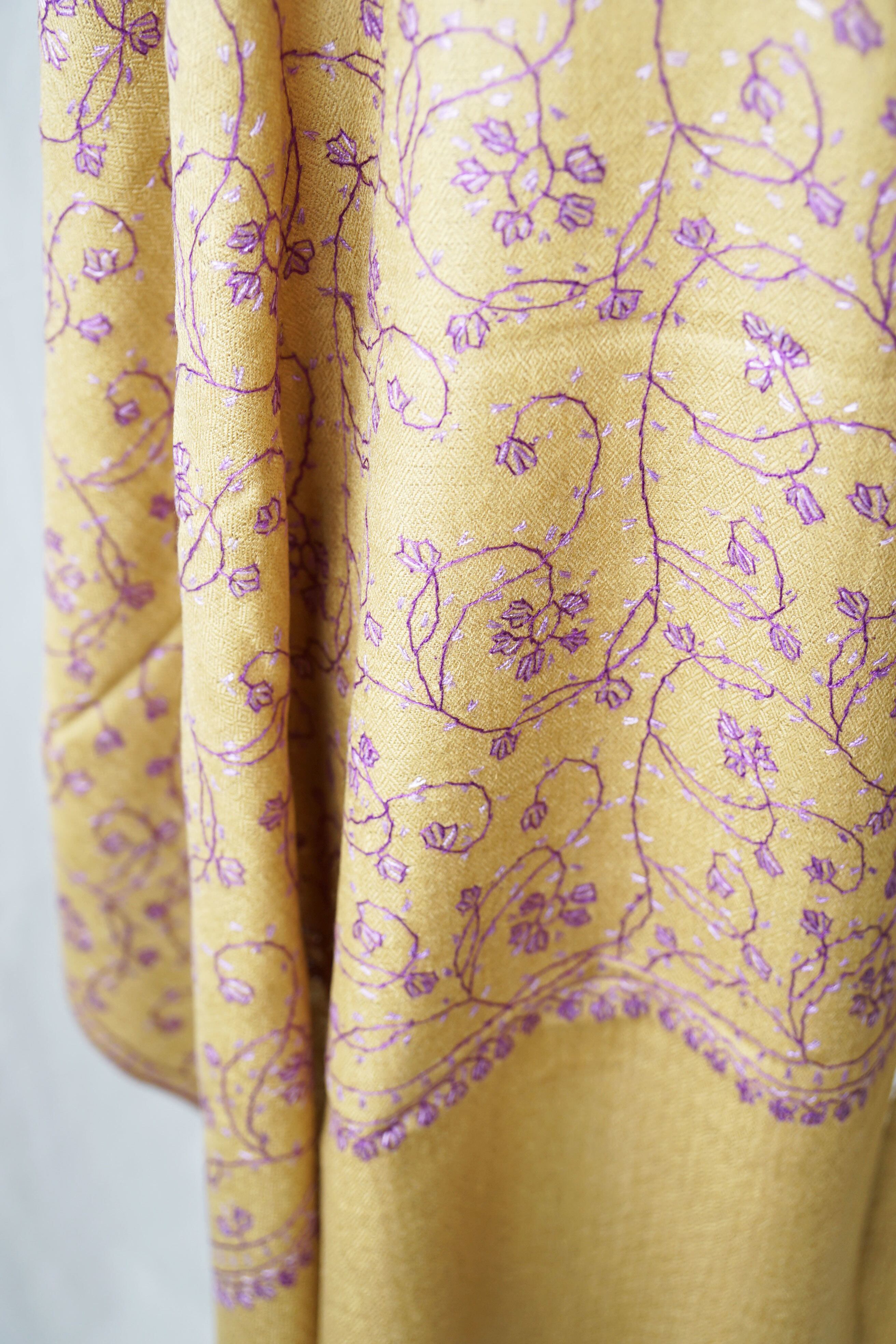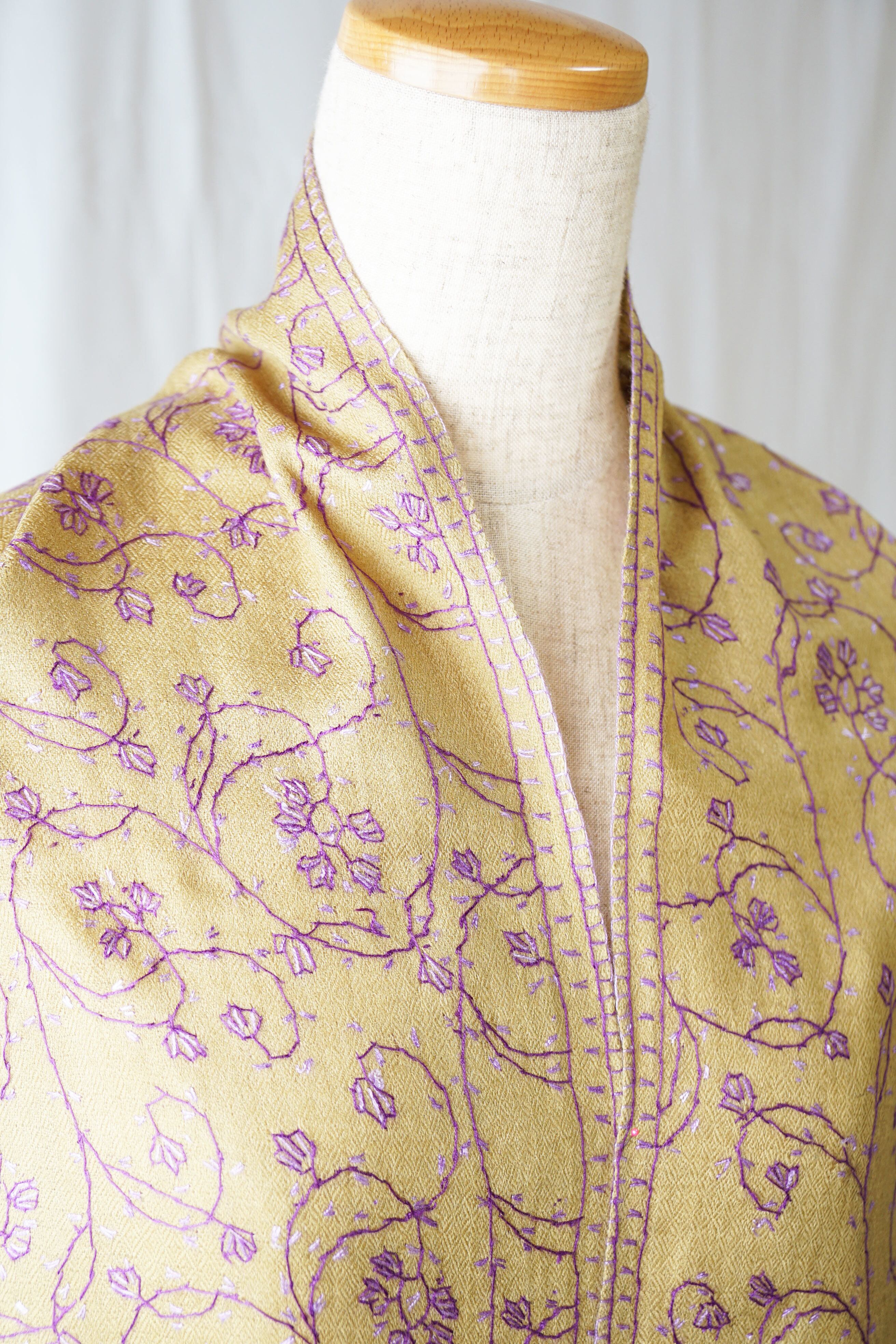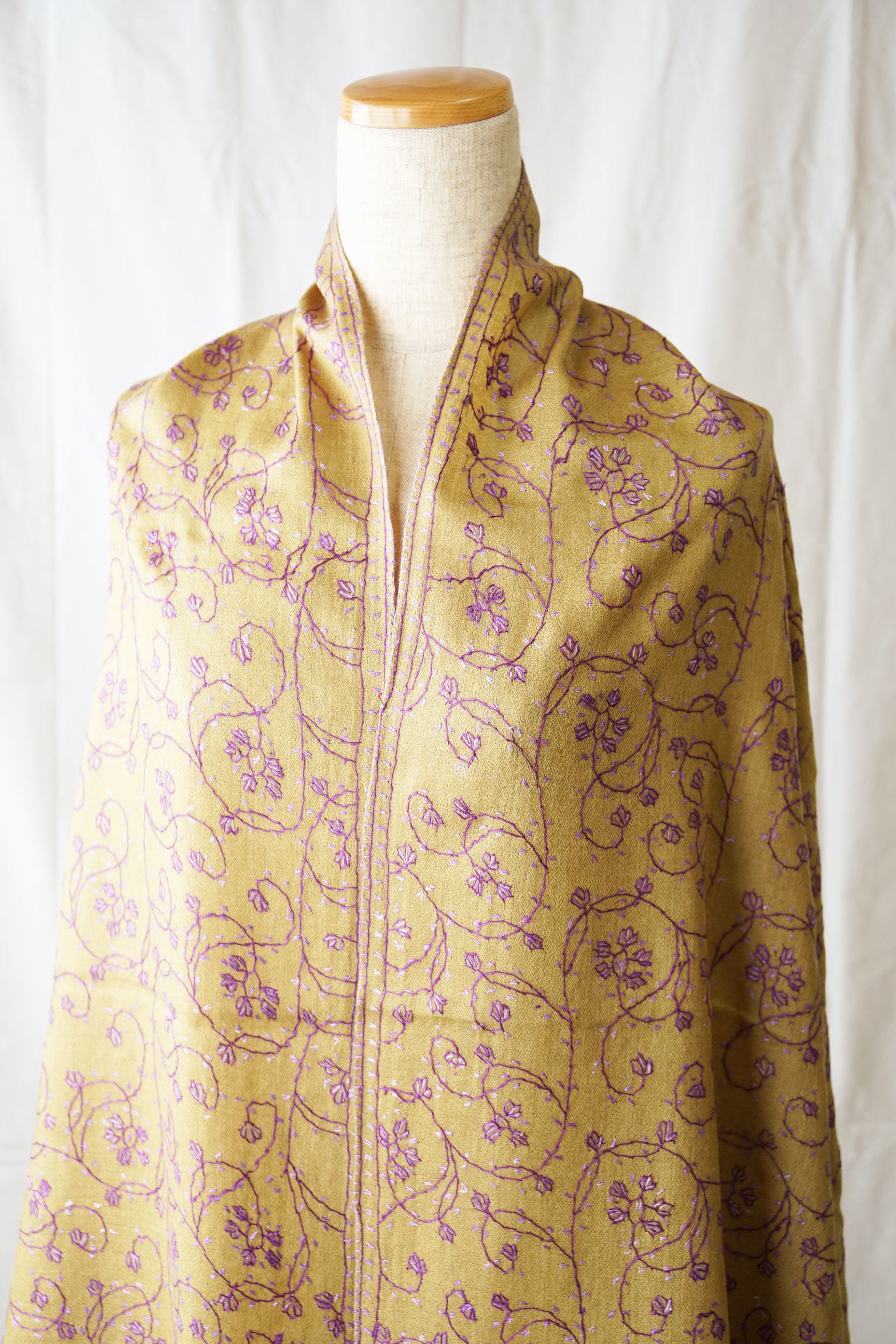 パシュミナストールに繊細なアラベスク模様のソズニ刺繍を施しています。