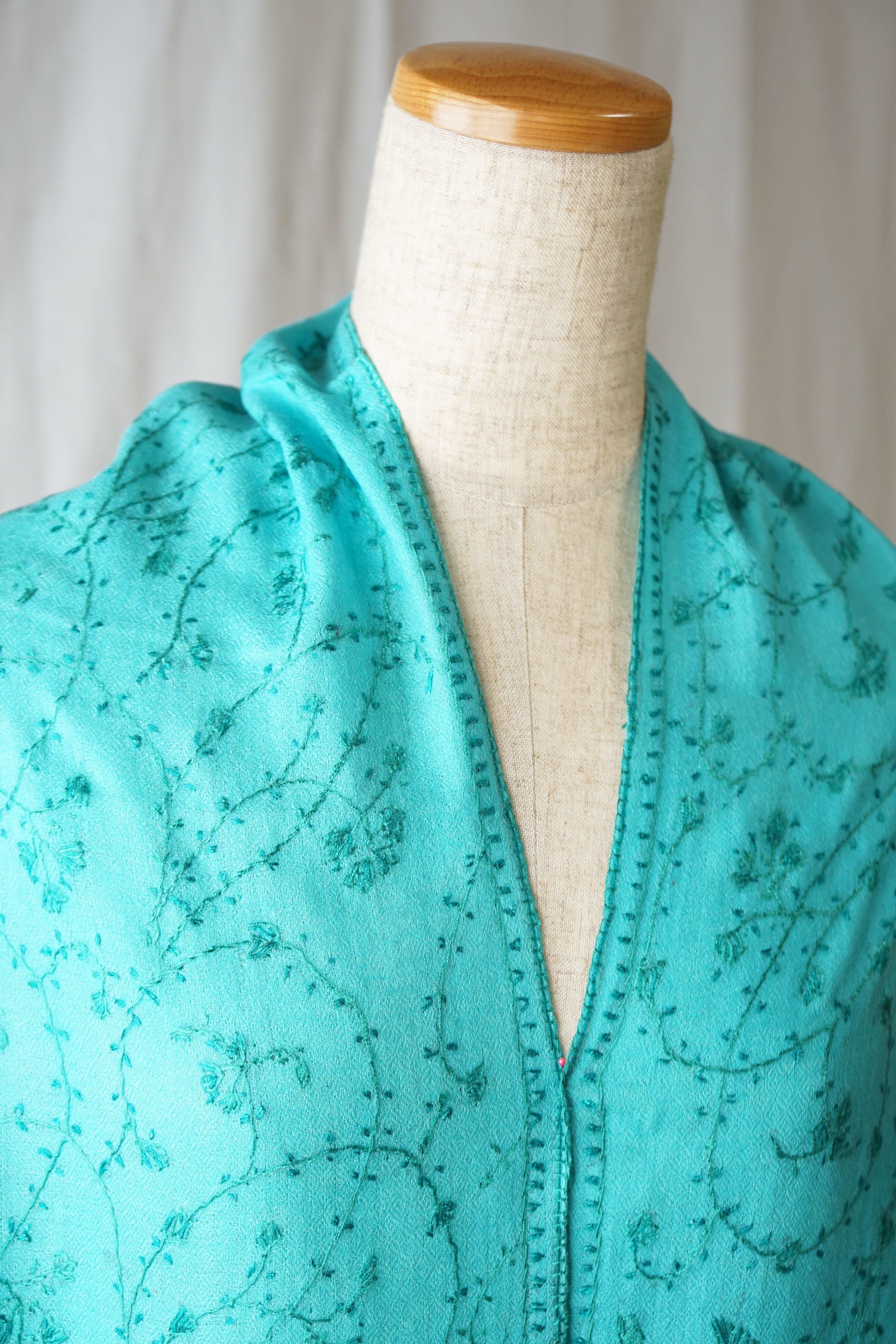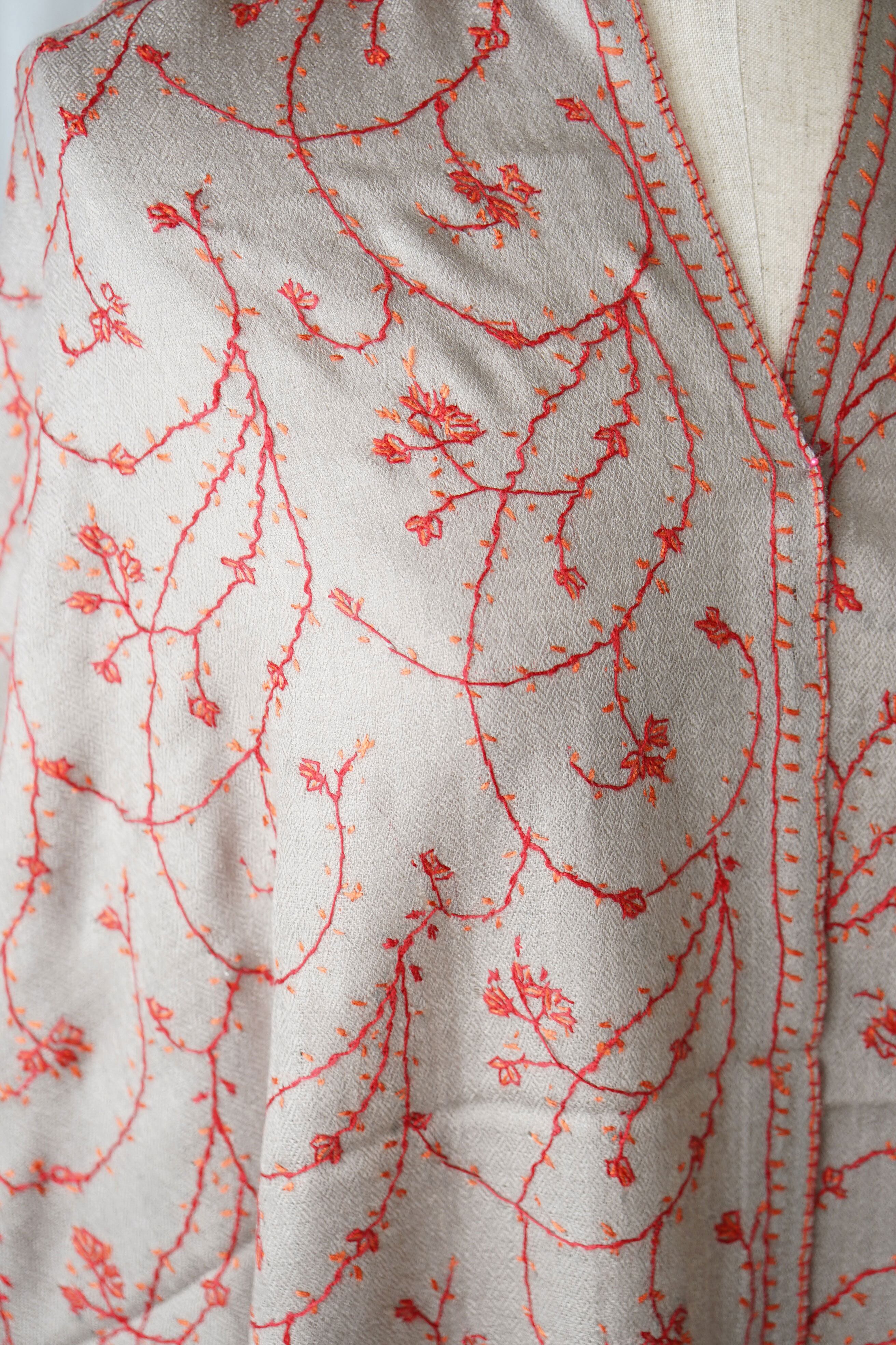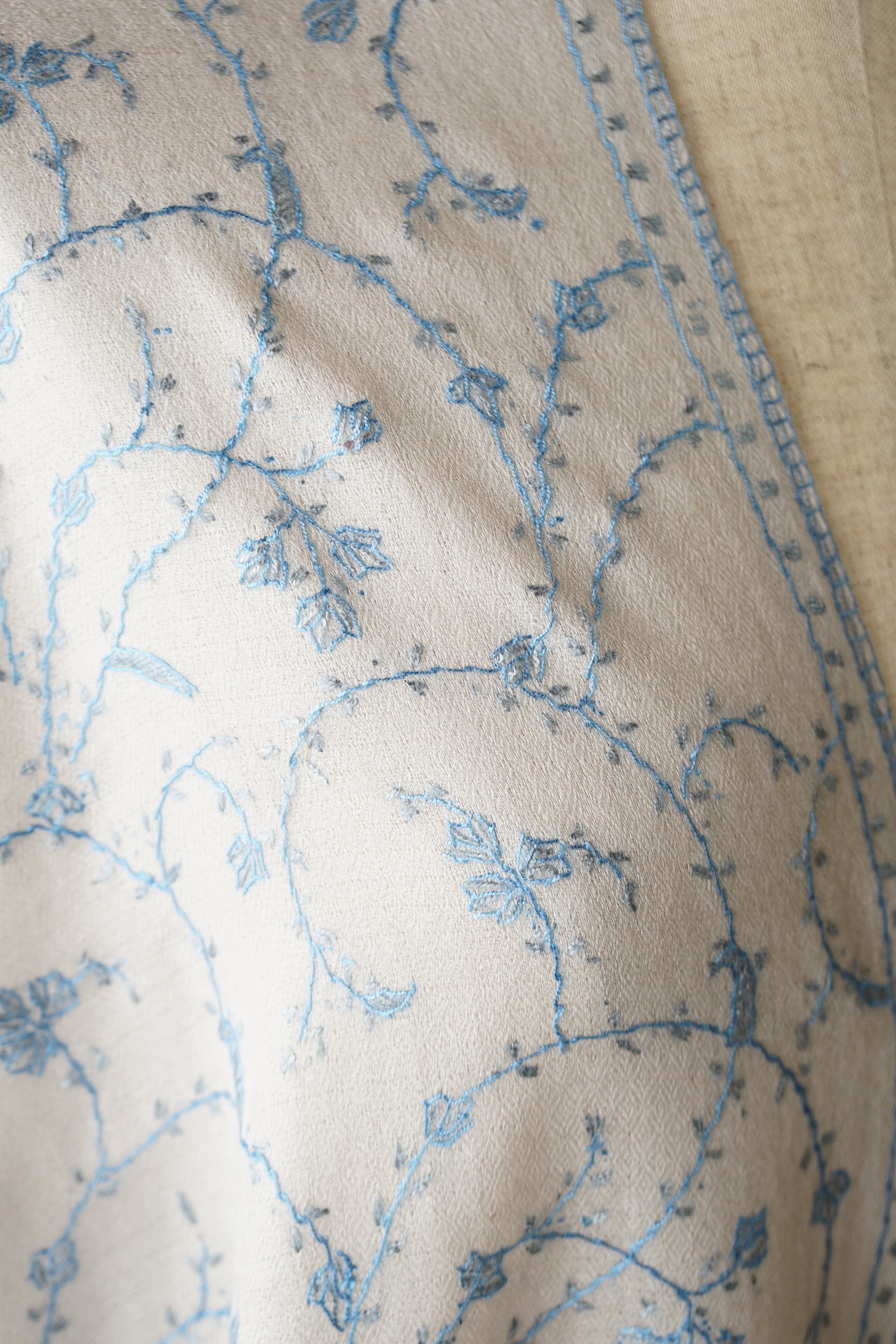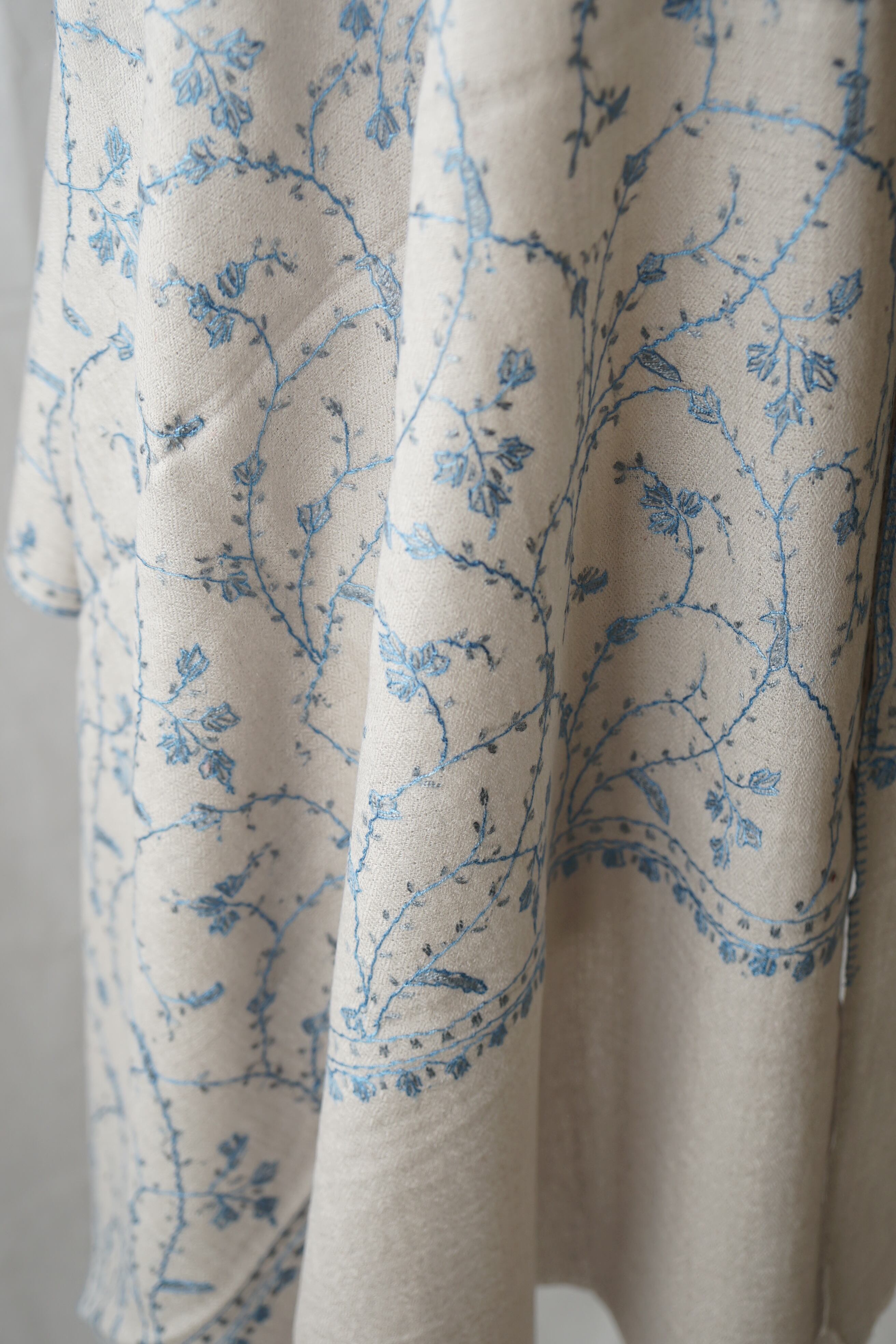 パシュミナストールに繊細なアラベスク模様のソズニ刺繍を施しています。