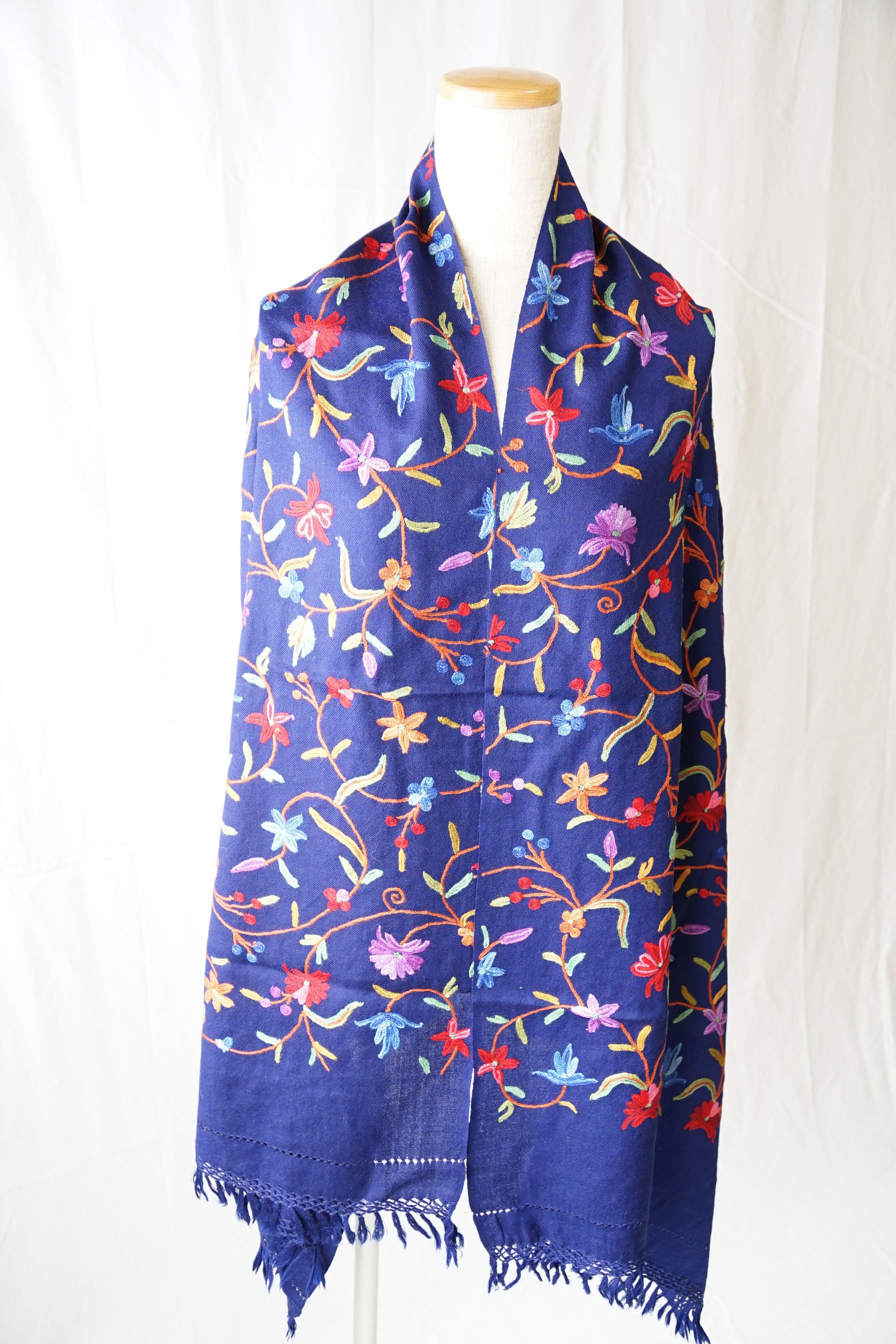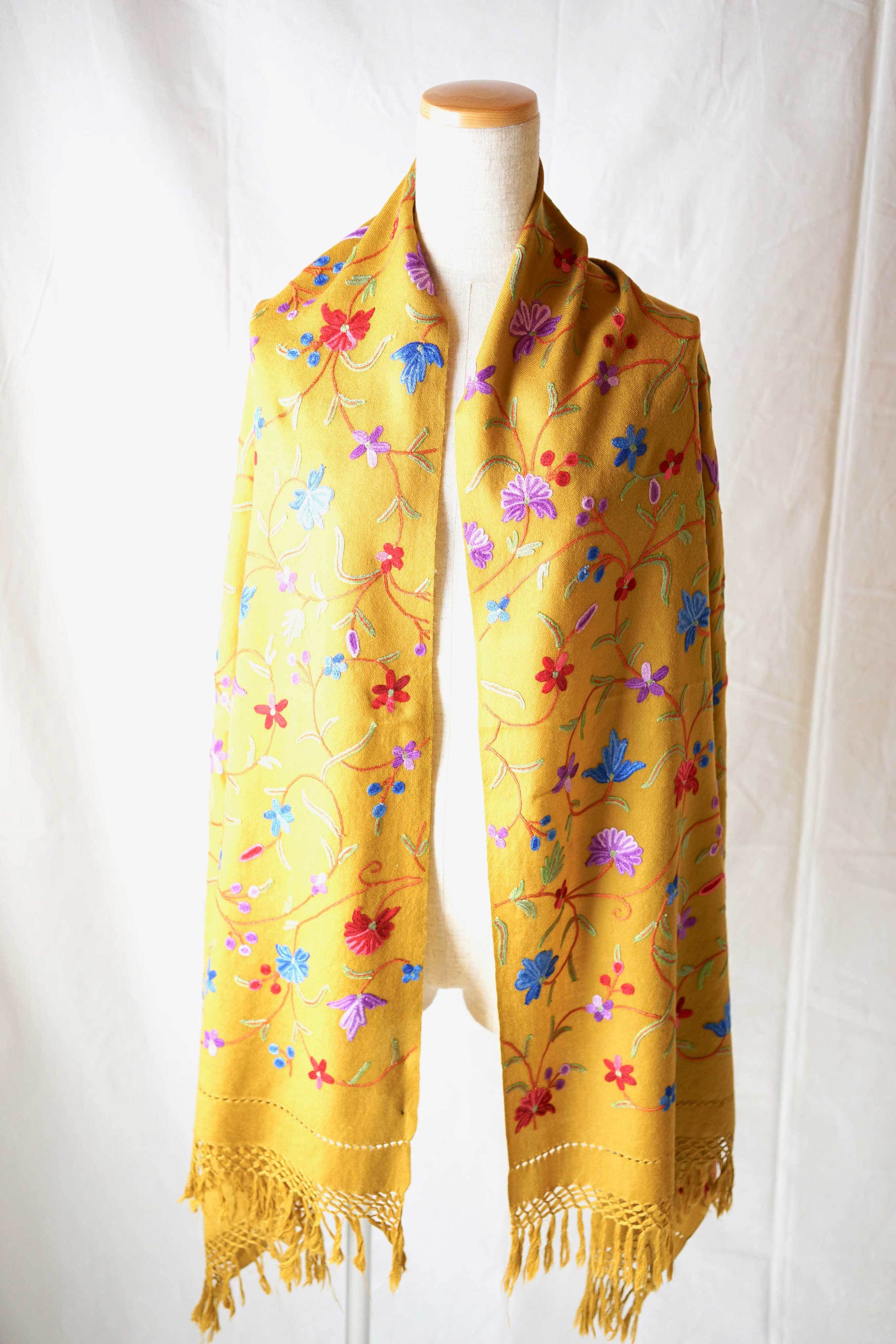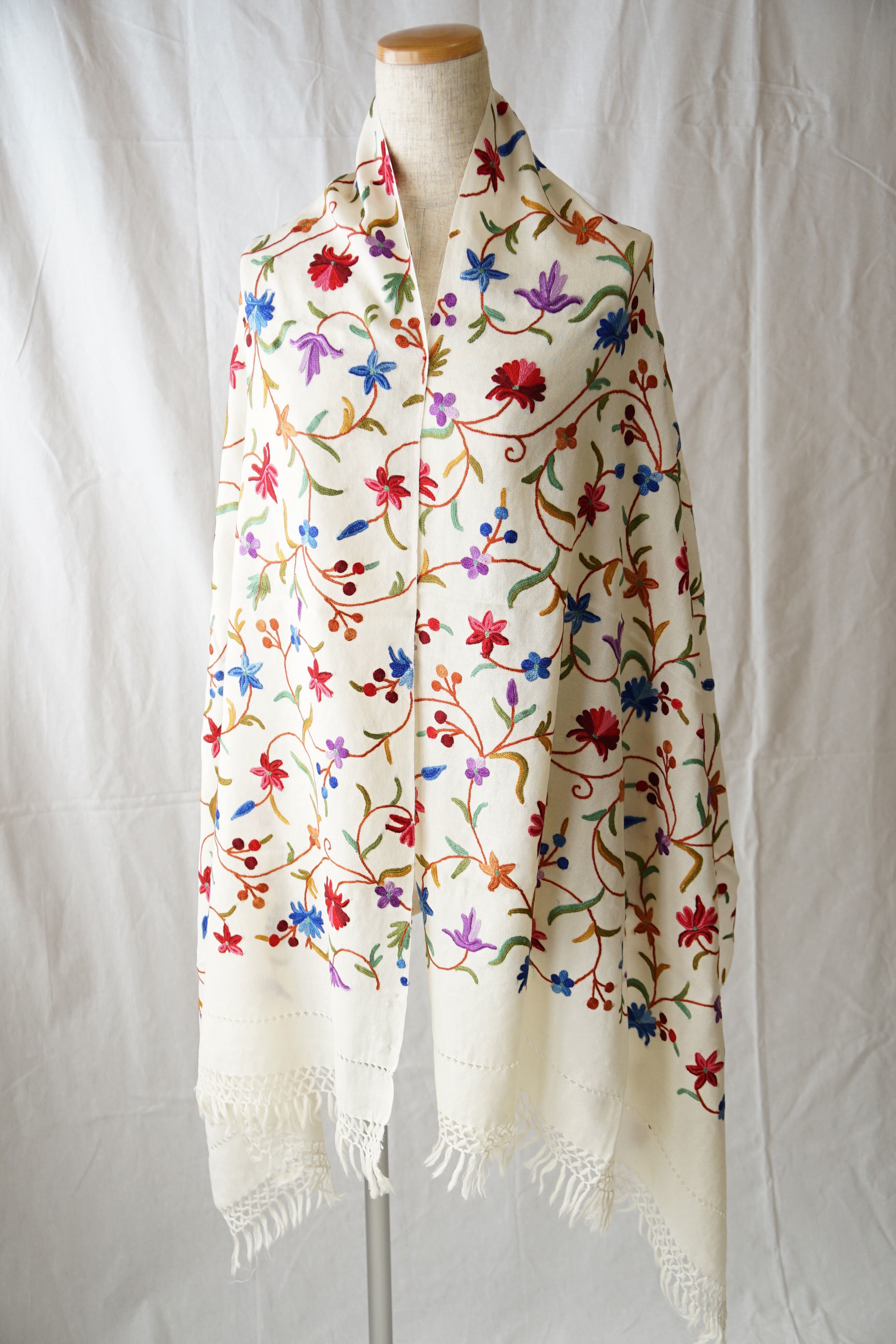 インド北西部カシミール地方に伝わる華麗な伝統刺繍工芸の一つ、アリワークと呼ばれる刺繍が施されたストールです。