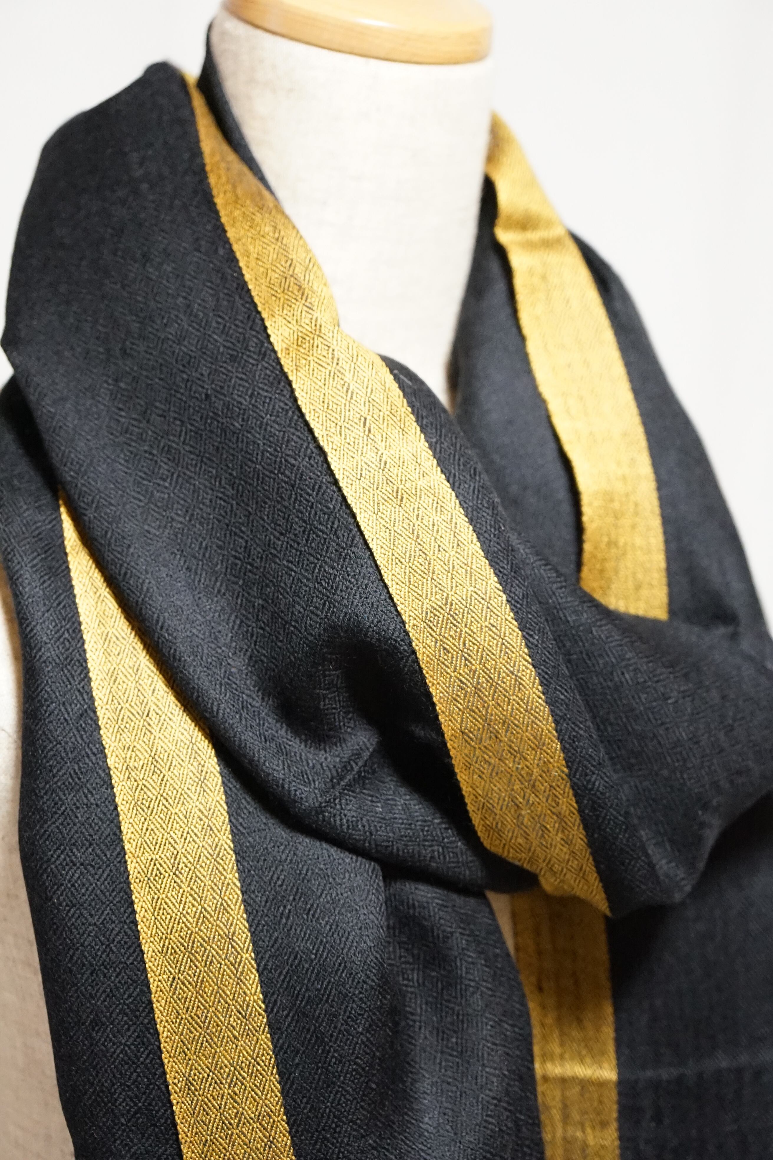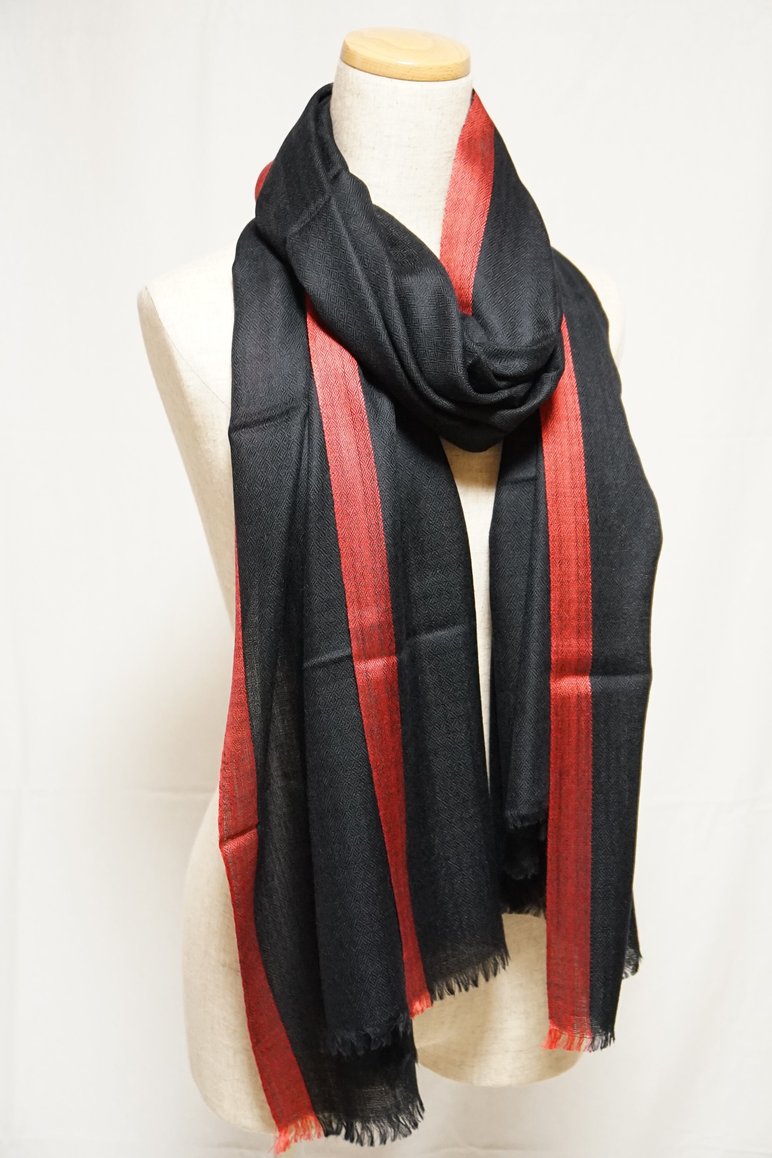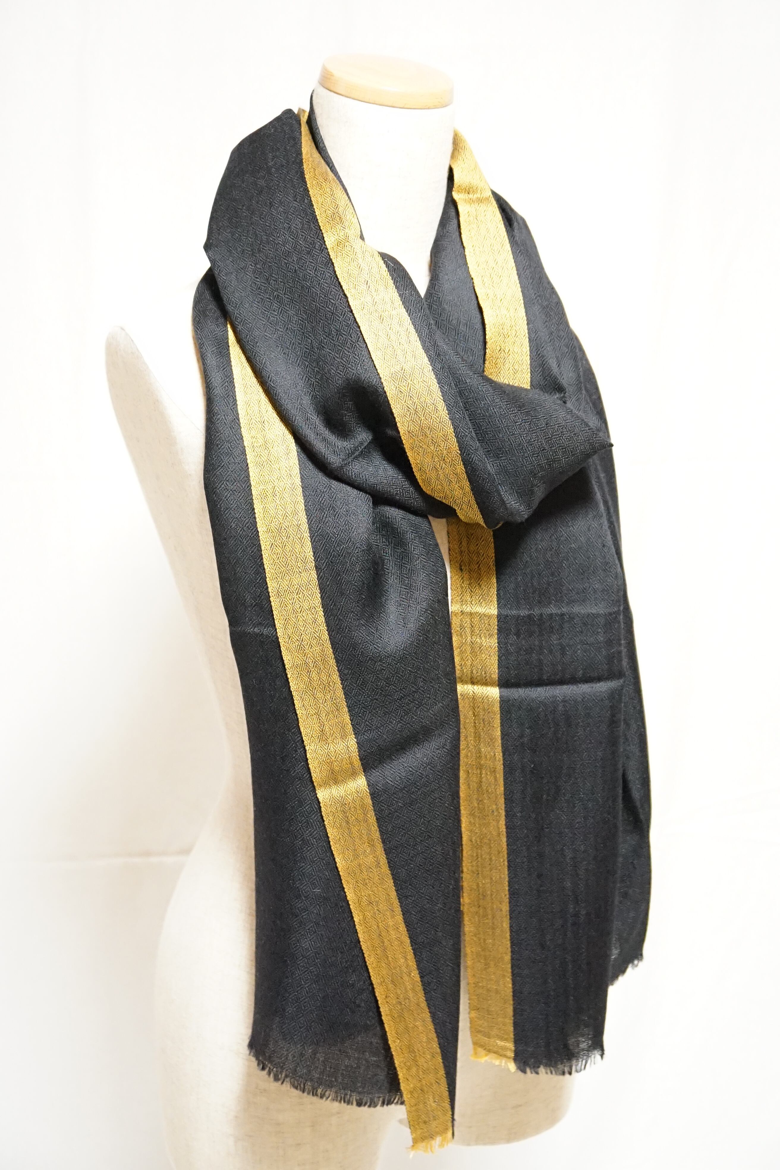 上品な縁ラインのパシュミナストールです。シルクのラインが施されたことで、パシュミナの柔らかさとシルクの輝きが見事に調和し、贅沢な質感を生み出しています。春から秋にかけて多様なシーズンで活躍し、コーディネートのアクセントとして大変魅力的な一品です。