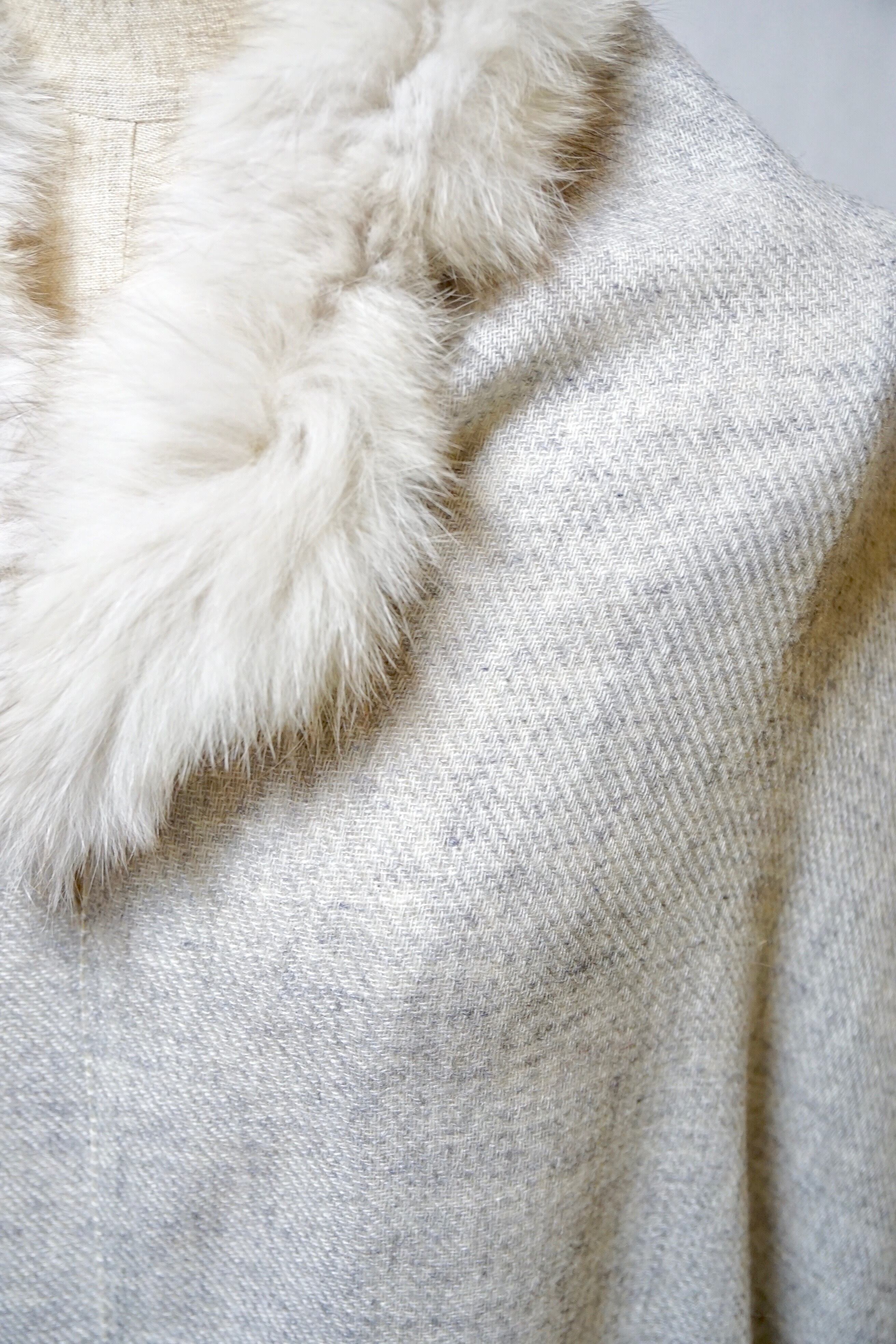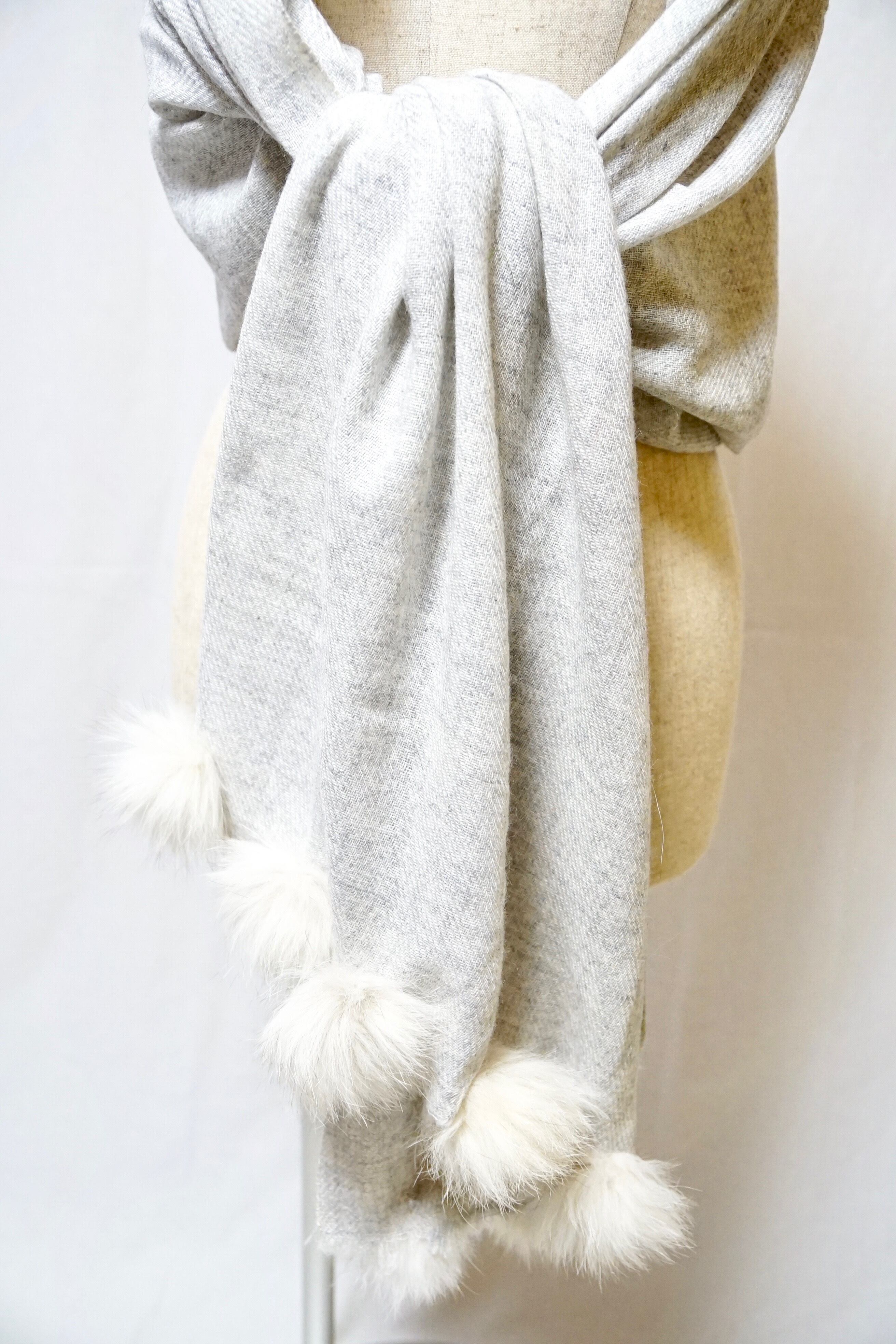 オフホワイトのファー、ライトグレーのパシュミナは清楚で、着こなしに優雅さを添えること間違いなしです。