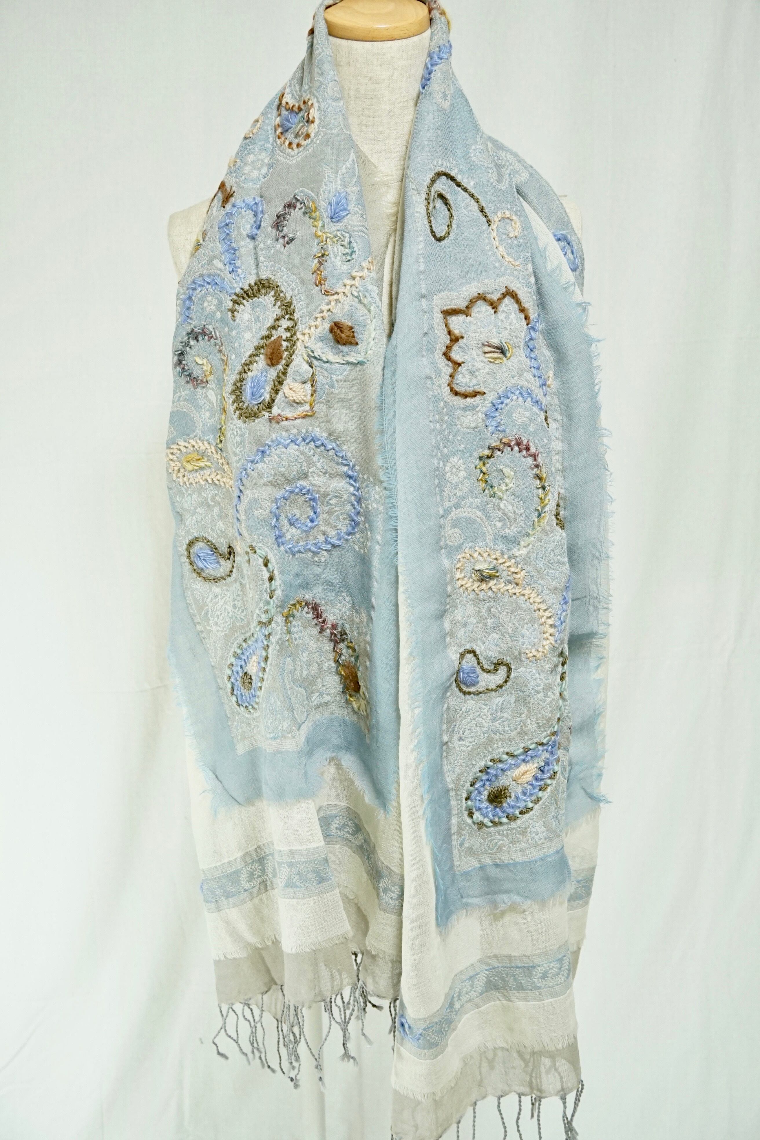 ガーゼのようなウールを3層に重ね、その上に毛糸の刺繍を施しました。