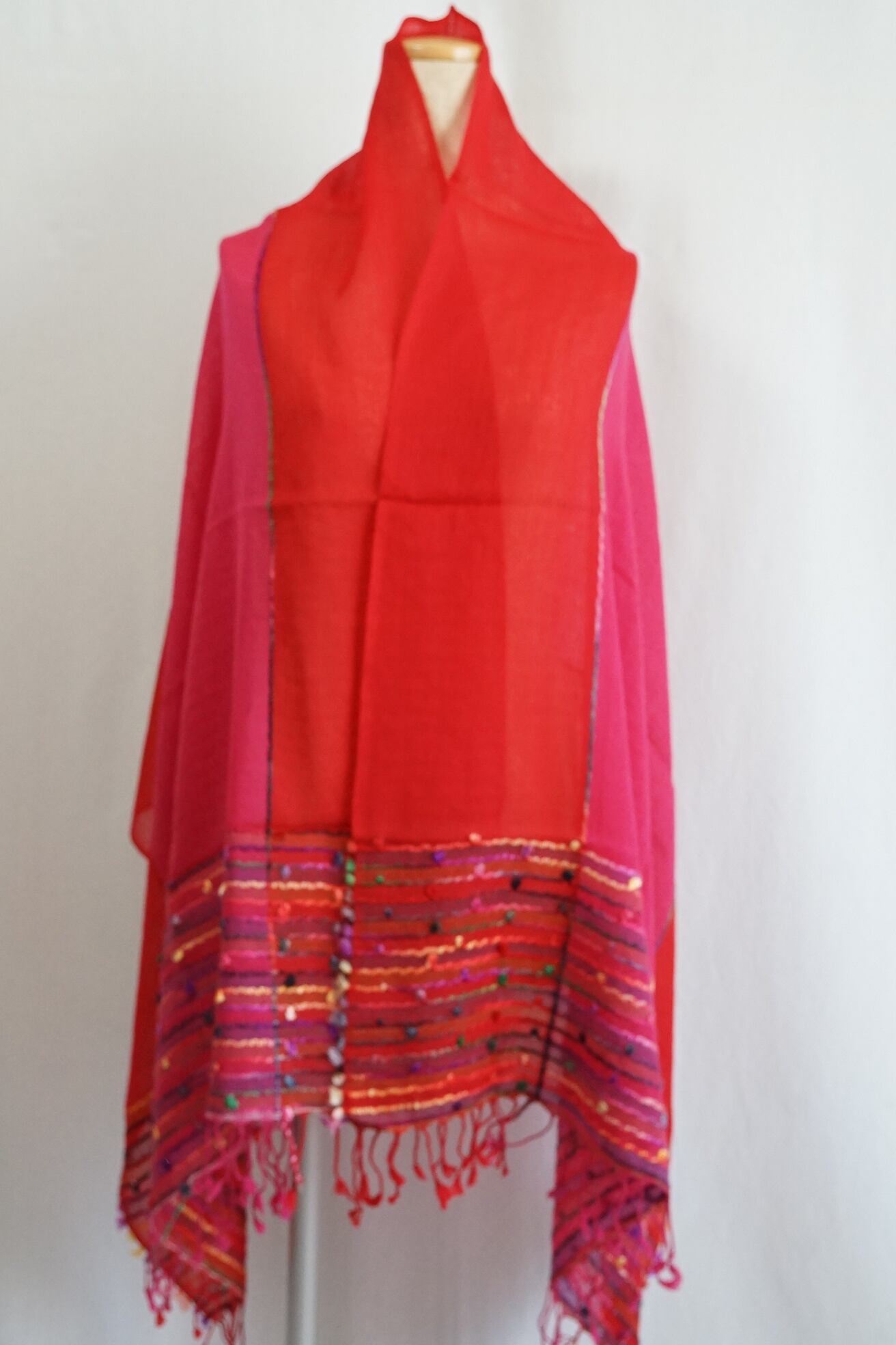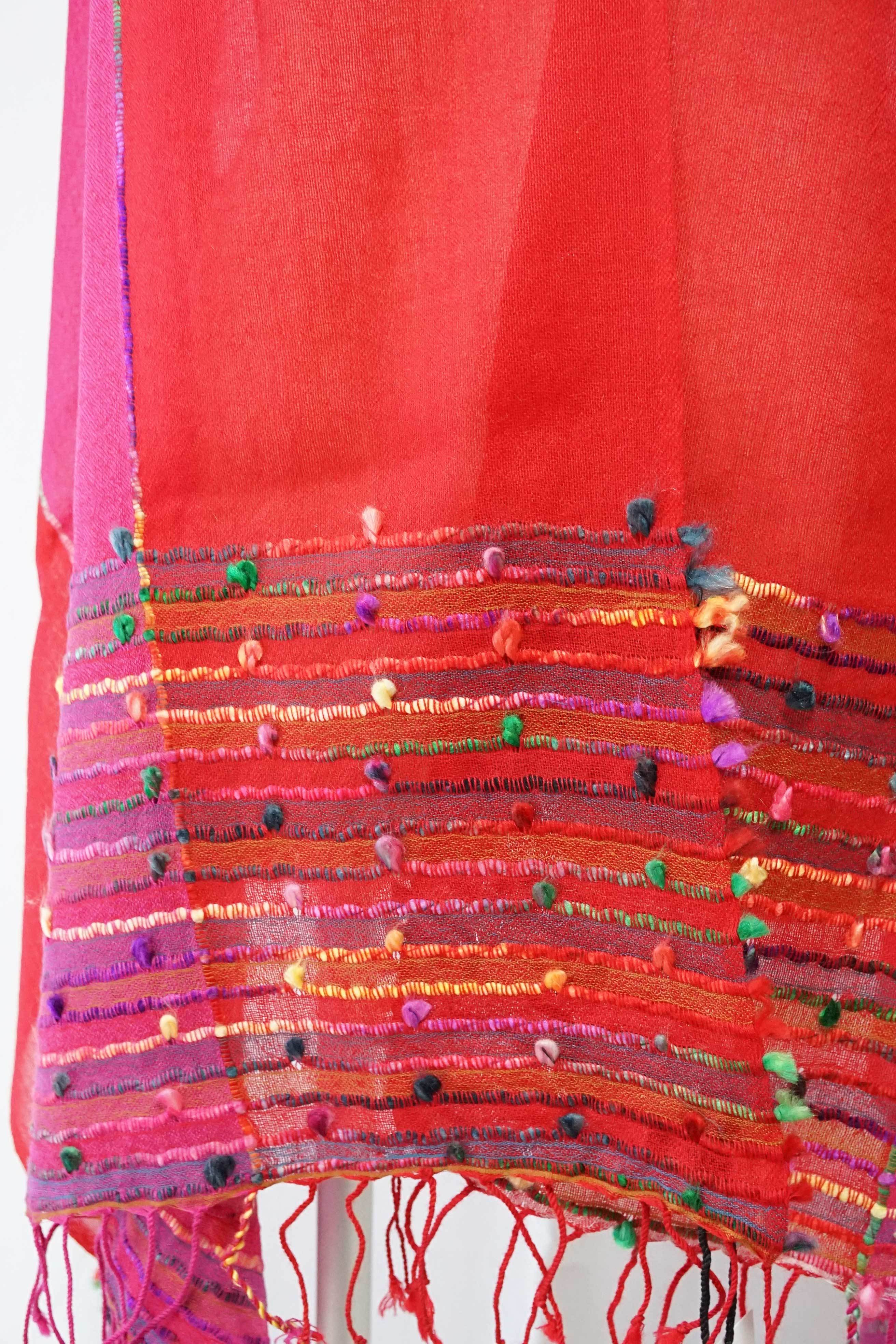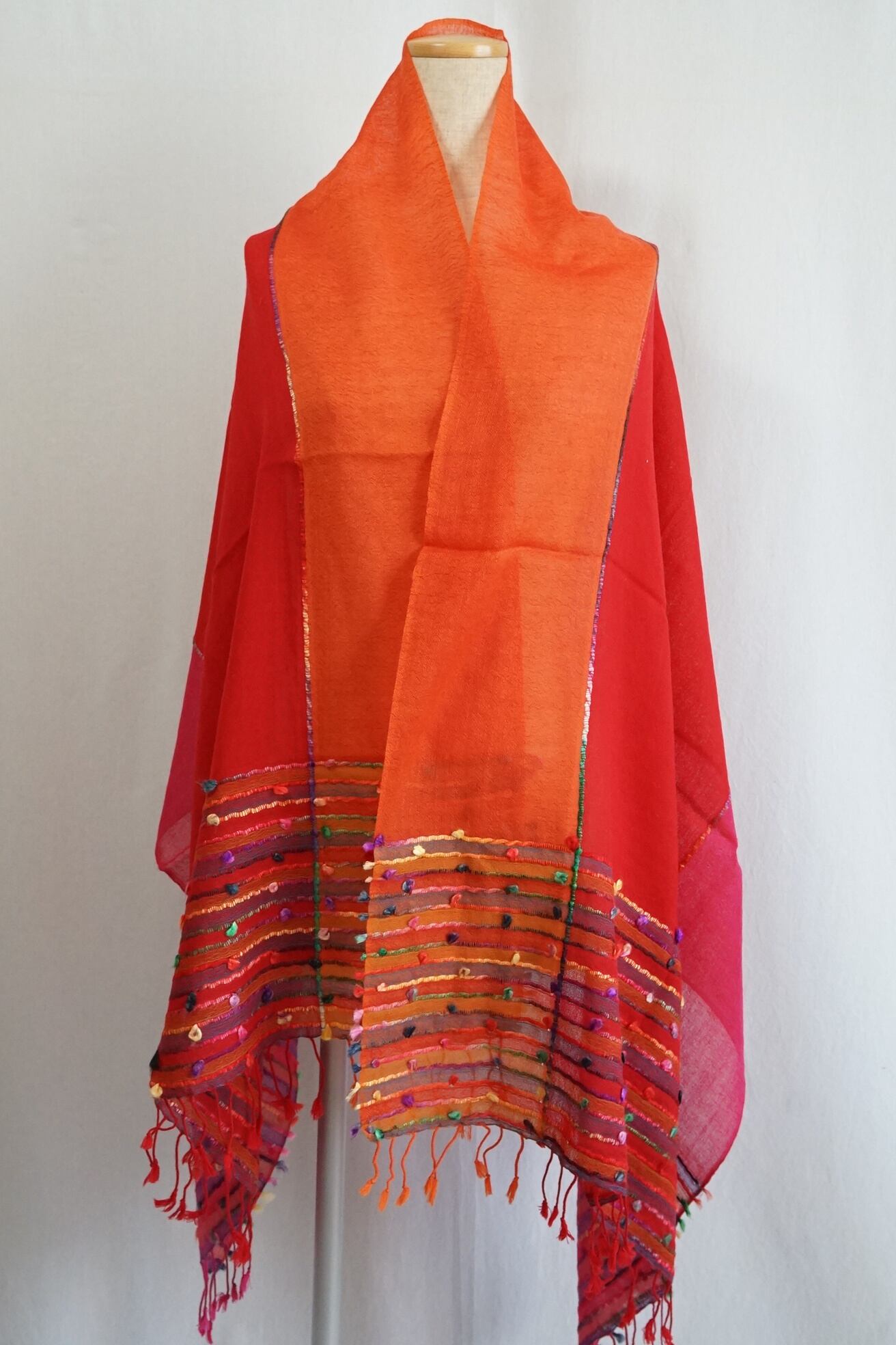 肌触りが優しく、裾ボーダーにカラフルなリングウール刺繍を施したウールストールです。