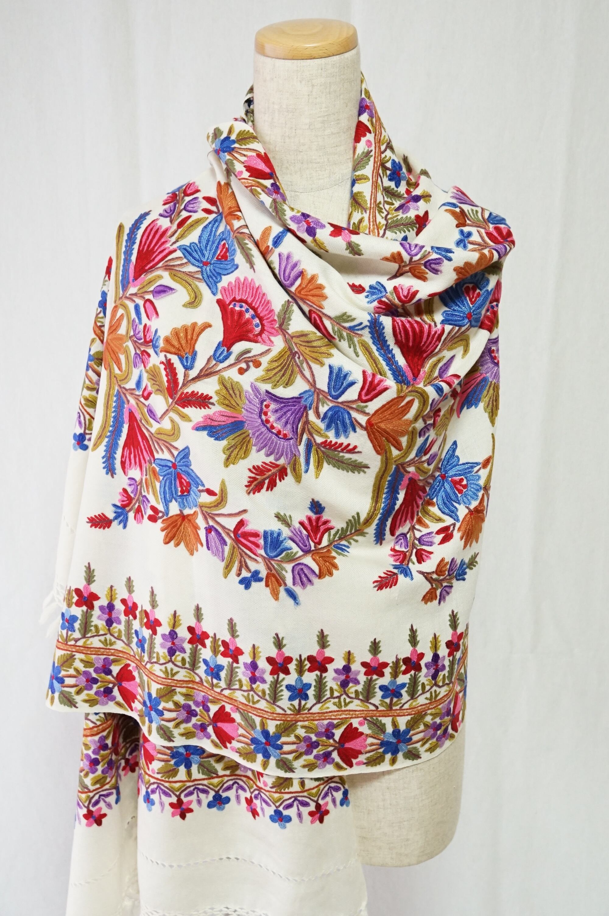 インド北西部カシミール地方に伝わる華麗な伝統刺繍工芸の一つ、アリワークと呼ばれる刺繍ストールです。